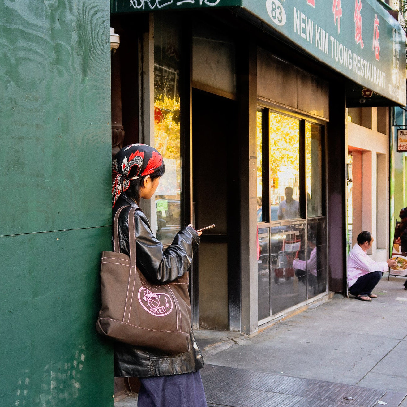 The ideal Chinatown tote: large enough for fresh greens, fruit and fish (or for sneakers and a ball), but compact enough for subway or bike rides. The Chinese writing, in traditional script, pays homage to the neighborhood: 唐人街篮球俱乐部 每周日十点 哥伦布公园.